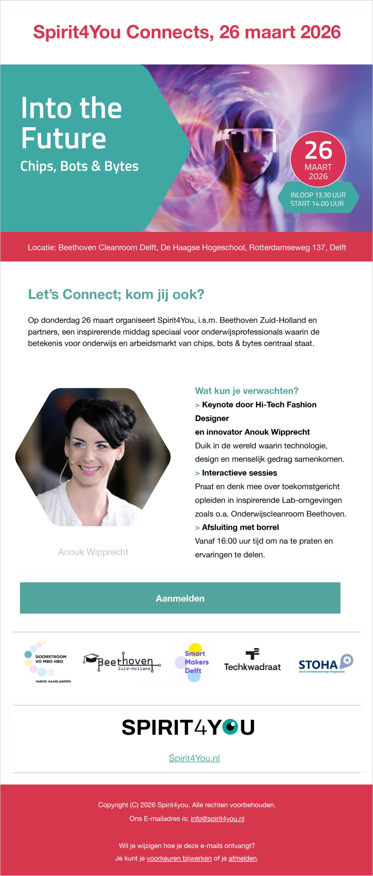 Op donderdag 26 maart 2026 organiseert Spirit4You, i.s.m. Beethoven Zuid-Holland, VABOK Haaglanden, Smartmakers-Delft, Techkwadraat en STOHA, een inspirerende middag speciaal voor onderwijsprofessionals waarin de betekenis voor onderwijs en arbeidsmarkt van chips, bots & bytes centraal staat.
